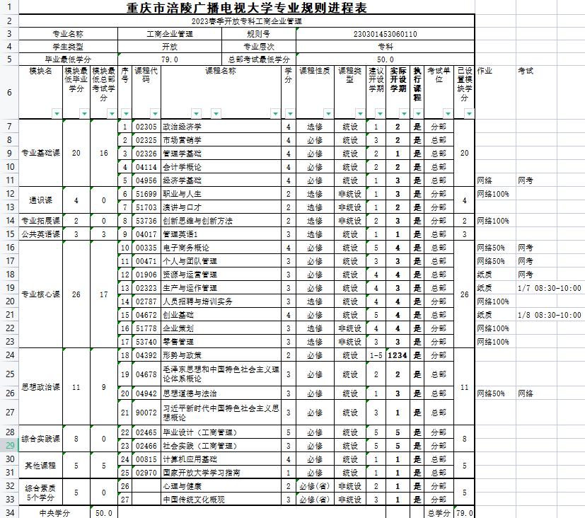 涪陵电大2023年春教学执行计划 开放专科工商企业管理
