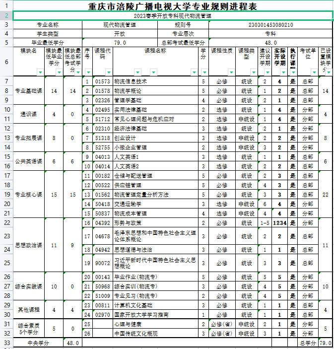 涪陵电大2023年春教学执行计划 开放专科现代物流管理
