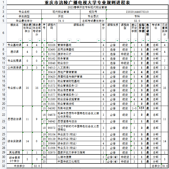 涪陵电大2023年春教学执行计划 开放专科现代物业管理