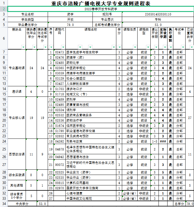 涪陵电大2023年春教学执行计划 专科药学