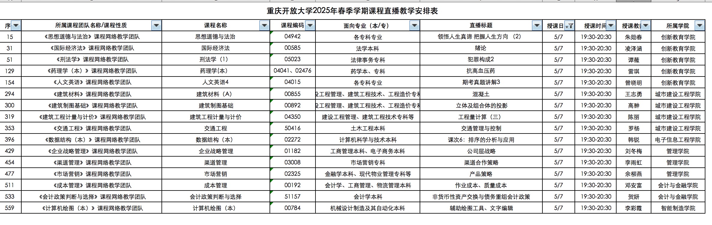 5月7日 --重开大、涪陵电大辅导课表