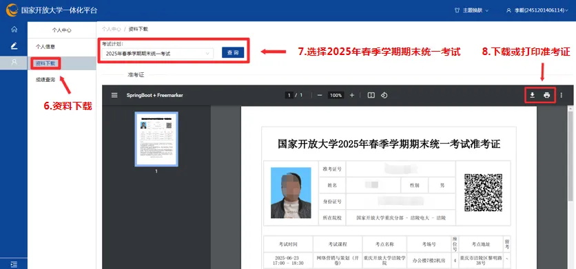 依次点击 “考试(学生端)” — “个人中心”,进入个人中心后点击左侧“资料下载”,确认是“2025年春季学期统一期末考试”后,点击准考证右上角的“下载”或“打印”图标。(若无法正常下载或打印准考证请及时与班主任老师联系)