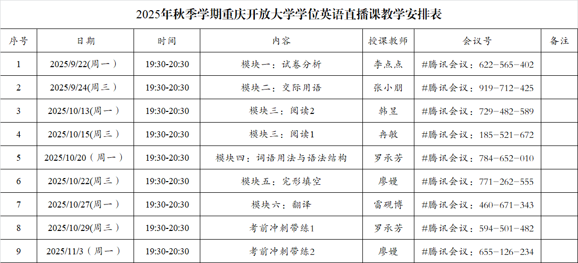 重庆开大本学期的学位英语线上直播辅导课已经开始上课了,请学生们注意学位的重要性和学位英语对于学位的重要性,希望大家积极按课表参加辅导课。