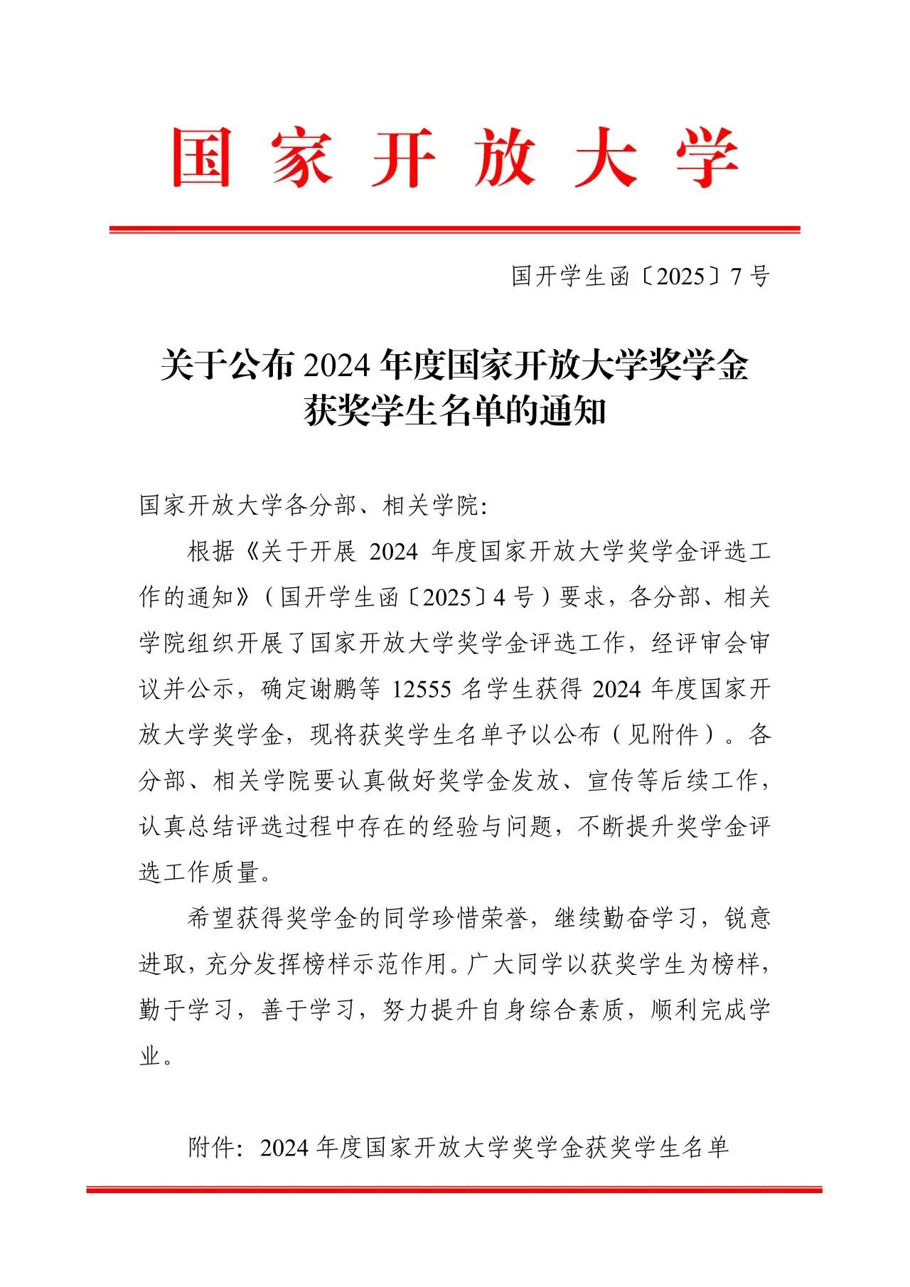 热烈祝贺我校鲁小松等20名同学荣获2024年度国家开放大学奖学金