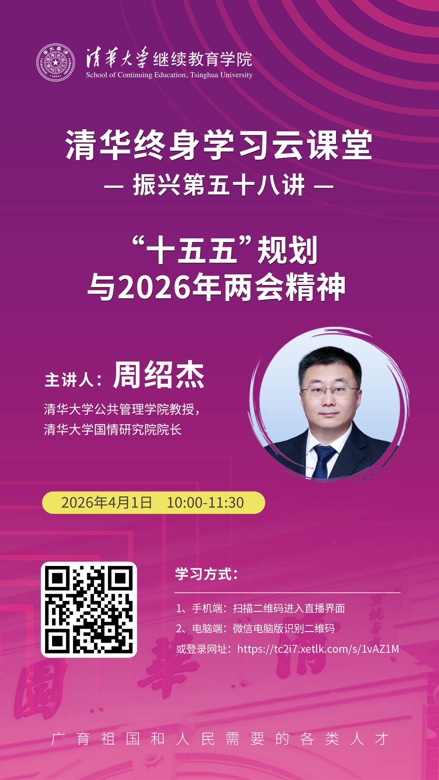 【时间】4月1日(周三)10:00-11:30 【项目】清华终身学习云课堂振兴系列 【主题】“十五五"规划与2026年两会精神 【适用对象】基层干部