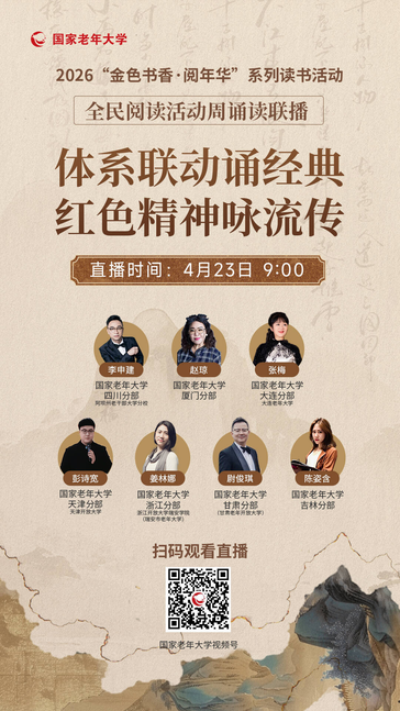 4月23日是世界读书日,国家老年大学举办2026“金色书香·阅年华"系列读书活动,体系联动诵读经典,直播时间4月23日9:00,请各单位组织收看直播。