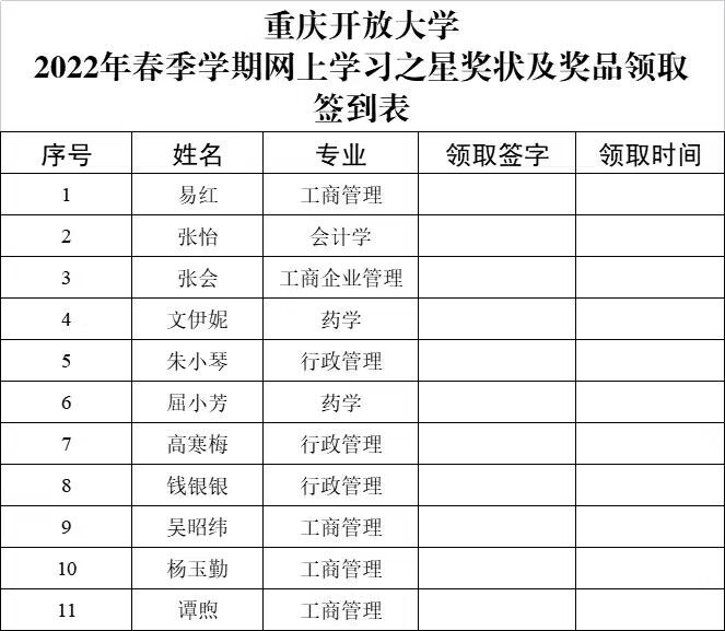 以下是涪陵电大2022秋季学期网学之星、2021年度国开大奖学金以及2022年春季学期重开大网学之星的学生获奖名单,请涉及到以上获奖学生的管理教师到教学处将奖状及奖品领取,将奖状及奖品发到获奖学生手中!