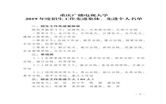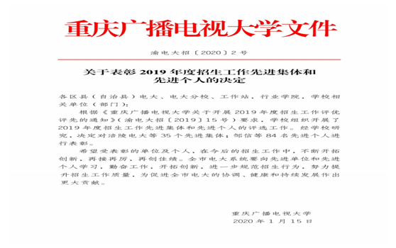 近日,重庆电大授予我校“2019年度招生工作先进集体”荣誉称号。此项荣誉的获得,既是对我校招生工作的充分肯定,也是对推动学校招生工作发展的一次有力鼓舞。