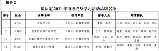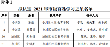 近日,从重庆市社区教育服务指导中心获悉,由涪陵区社区教育学院选送的百姓学习之星黄希扬被评为2021年重庆市“百姓学习之星”,并选送参评全国百姓学习之星;《龙潭“八牌锣鼓”非遗传习所》项目,经专家评审,获得2021年重庆市“终身学习品牌”荣誉称号。