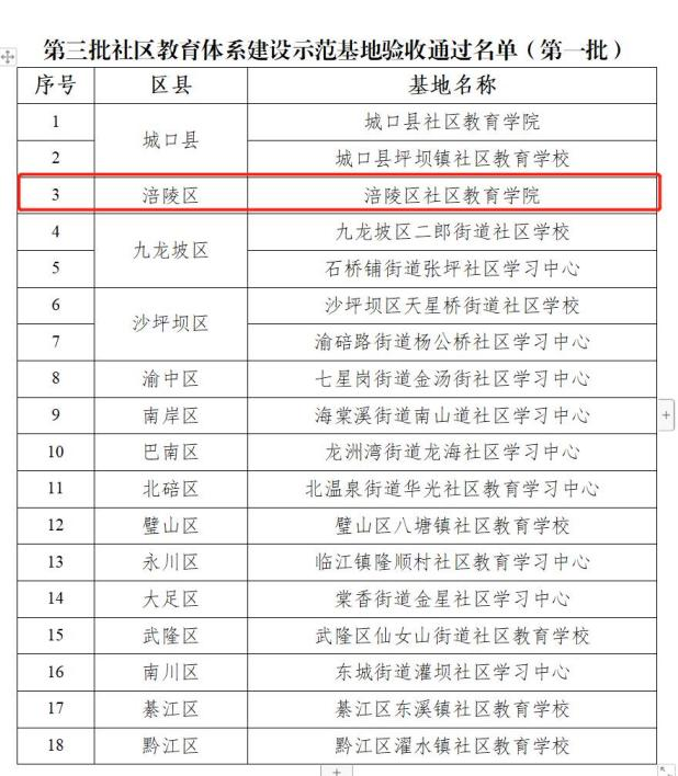 近日,重庆市社区教育服务指导中心聘请专家组按照《关于开展第三批示范基地和游学项目验收的通知》(渝社教办〔2023〕2号)工作要求对涪陵区社区教育学院进行验收,专家组对涪陵区社区教育学院体系建设工作各项指标进行逐项评估,达到合格标准,成为市级社区教育体系建设示范基地。
