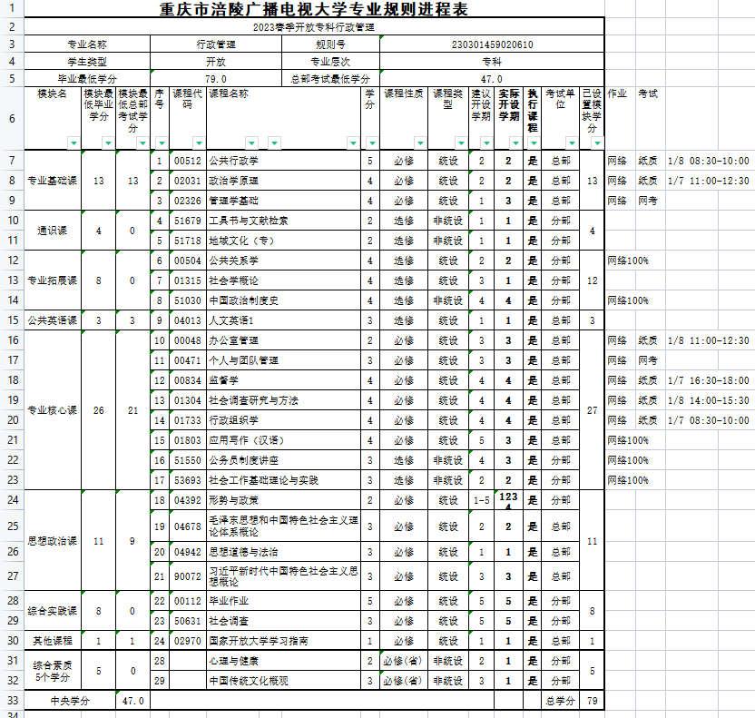 涪陵电大2023年春教学执行计划 开放专科行政管理