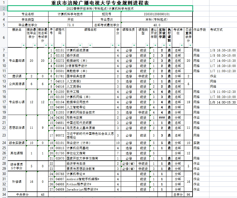 涪陵电大2023年春教学执行计划 开放本科(专科起点)计算机科学与技术