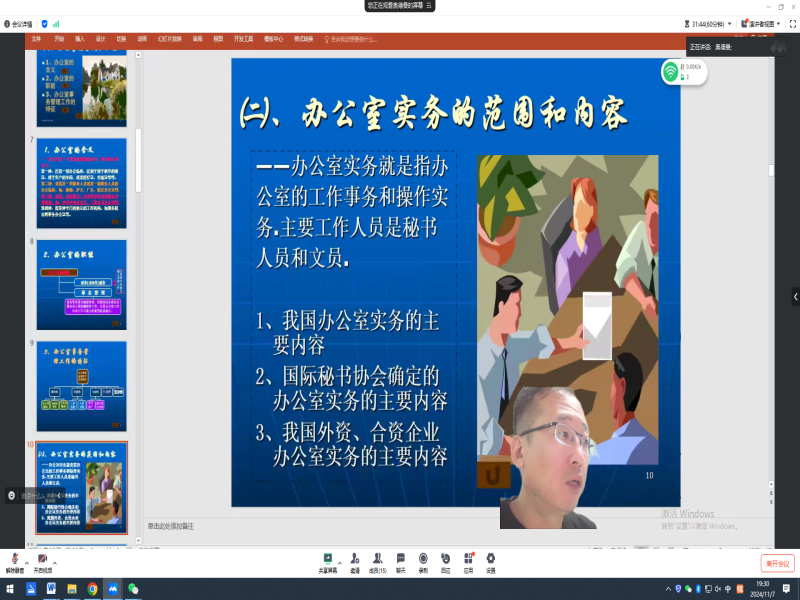 2024年11月7日我校王晓东、雷昊宇和杨林佩三位老师仍然坚守在教学辅导一线的讲台上,利用腾讯会议的方式给学生进行《办公室管理》、《建筑构造》和《儿童家族教育指导》课程的网上直播辅导。