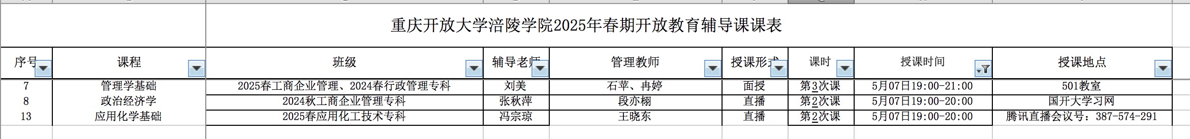 5月7日 --重开大、涪陵电大辅导课表