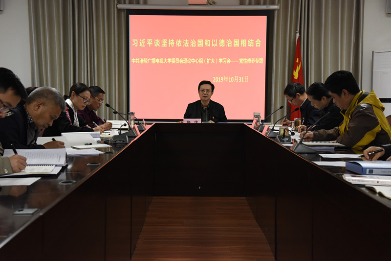 10月31日下午,我校党委理论学习中心组(扩大)召开“党性修养”专题学习讨论会议,除个别干部因公外出,其他中层以上干部全部参加。党委书记、校长邹信同志传达了《关于强化政治建设,坚持做到“两个维护”严格落实网络意识形态工作责任制的具体措施的通知》(涪委网办﹝2019﹞42号),并领学了习近平总书记关于依法治国与依德治国的重要论述。党委委员、纪委书记周鸿鹄同志主持会议。