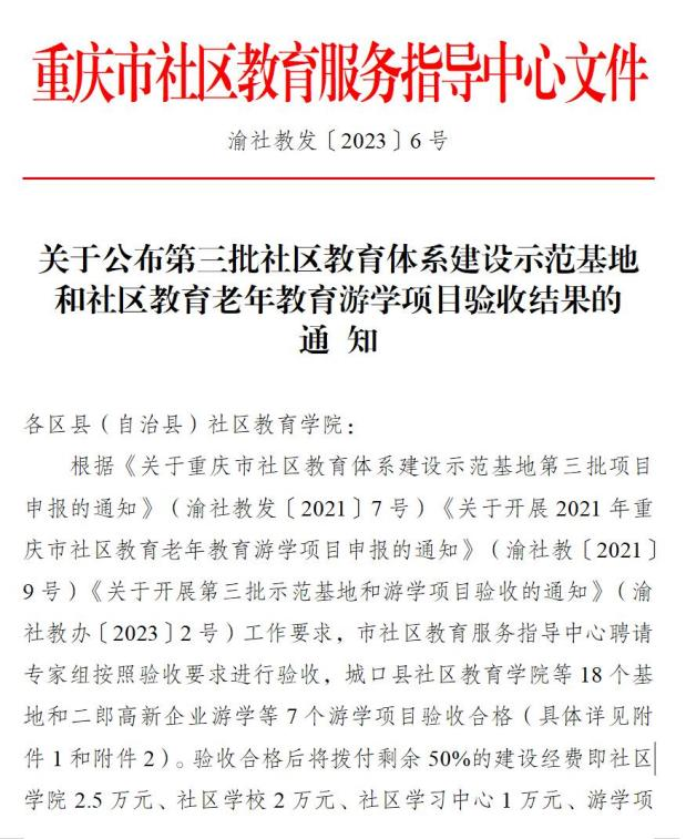 近日,重庆市社区教育服务指导中心聘请专家组按照《关于开展第三批示范基地和游学项目验收的通知》(渝社教办〔2023〕2号)工作要求对涪陵区社区教育学院进行验收,专家组对涪陵区社区教育学院体系建设工作各项指标进行逐项评估,达到合格标准,成为市级社区教育体系建设示范基地。